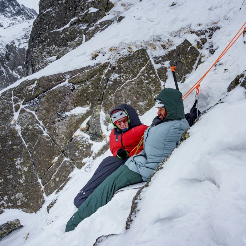 Sac de couchage d’escalade et d’alpinisme -10°C avec membrane imper-respirante et ouverture centrale. Garni de 600 g de duvet d’oie polonais de 800 cuin.