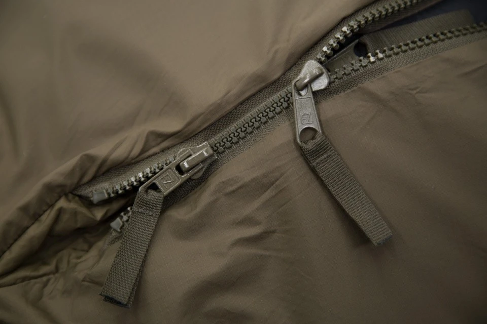 Fermeture éclair sur le côté gauche du sac de couchage avec zip double curseur, permettant de l’ouvrir par le bas ou le haut. La construction trapézoïdale pour plus de confort au niveau des pieds.