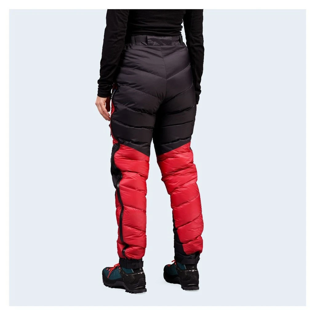 Il est muni de fermetures éclair intégrales et résistante aux infiltrations d’eau. Elles permettent de mettre ou retirer le sur-pantalon sans devoir enlever ses chaussures. Un rabat protecteur interne est situé le long des fermetures éclair. La Largeur des chevilles est ajustable par velcro et bouton-pression. Le Transition Down Pants Lady dispose d’une ceinture et d’un tour de taille élastique. Des poches zippées sont situées sur les jambes.