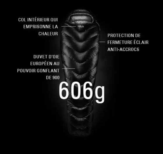 Le sac de couchage Mythic Ultra 360 de Rab est garni avec 360 grammes de duvet d’oie européen hydrophobe certifié RDS de 900 cuin. Il est combiné à la technologie TILT (Thermo Ionic Lining Technology) qui lui confère une isolation supplémentaire. Cette technologie permet de réduire les pertes de chaleur radiative et de réfléchir la chaleur corporelle en direction de la personne. Elle confère un niveau de chaleur plus élevé et de bénéficier au sac de couchage un excellent ratio chaleur/poids.