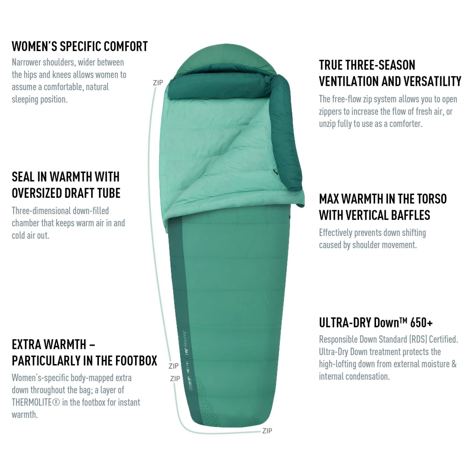 Le Journey JOII de Sea to Summit est un sac de couchage 3 saisons qui présente l’avantage d’avoir une forme rectangulaire. En effet, cette forme fuselée n’a pas l’inconvénient d’une forme momie/sarcophage limitant alors les mouvements à l’intérieur du sac de couchage. Conclusion : avec sa forme rectangulaire au niveau des pieds, le confort est assuré tout en optimisant l’apport thermique.